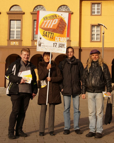 6 "Abgeordnete" vom Wittener Bündnis gegen TTIP/CETA/TISA informierten am Samstag, 17. Jan. 2015 die Mitbürger über die Themen der Demo "WIR HABEN ES SATT" in Berlin (zwei sind nicht im Bild) |